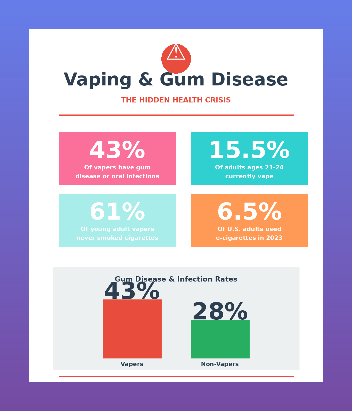 * 43% of e-cigarette users have gum disease and oral infections, compared to only 28% of non-vapers, according to a 2020 study